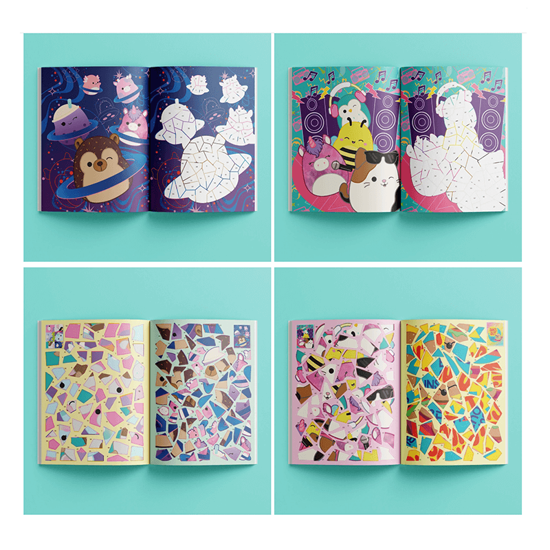 Plonge dans un univers kaléidoscopique d’art en autocollants. Ce cahier propose des illustrations géométriques mettant en vedette différents styles uniques de Squishmallows, que tu pourras compléter à l’aide de centaines d’autocollants aux formes variées.